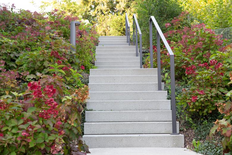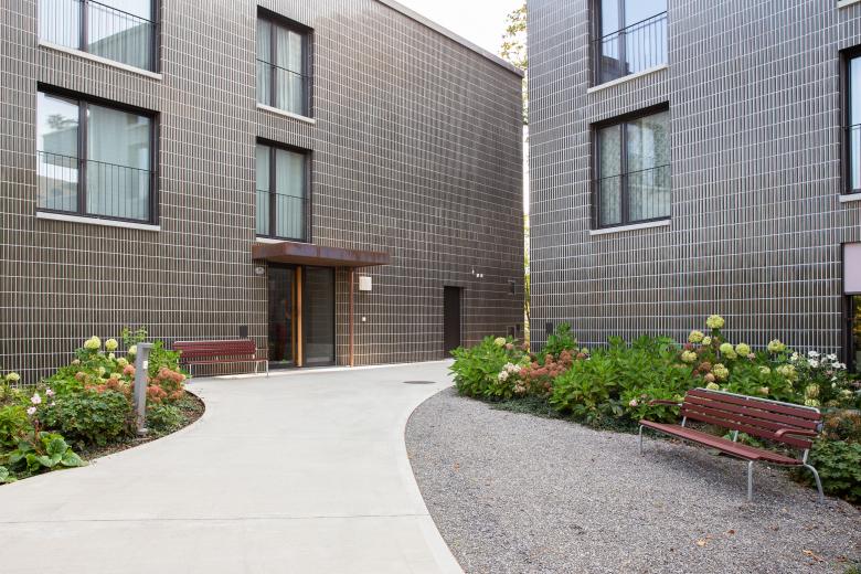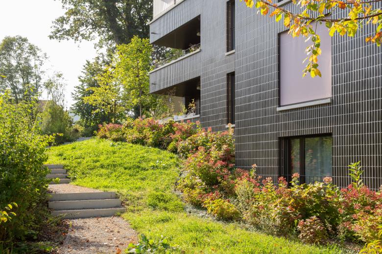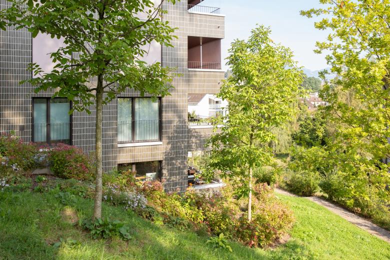 Die beiden komfortablen Häuser im bevorzugten Rosenbergquartier am nördlichen Stadtrand von Luzern genügen nicht nur architektonisch, sondern auch hinsichtlich der Freiraumgestaltung hohen Ansprüchen. Der alte Hochstamm-Baumbestand mit Kirsche, Ahorn und Eiche wurde bewahrt und mit einheimischen Solitärbäumen wie Vogelbeere ergänzt. Repräsentative Blühpflanzenflächen mit Rosen, Hortensien und Stauden bilden abwechslungsreiche Farbtupfer und lassen die Jahreszeiten erleben. Ein geschwungenes, barrierefreies Wegenetz verbindet lauschige Gartensitzplätze, bequeme Sitzgelegenheiten und Spielangebote miteinander und ist dank dezenter Beleuchtung auch nach der Dämmerung sicher begehbar. Veloabstellplätze, Lüftungsschachte und weitere Infrastruktur passen sich optimal in die Umgebung ein. An den Übergängen zu den benachbarten Grundstücken bilden Sträucher wie Holunder, Heckenkirsche oder Liguster eine lockere natürliche Grenze.