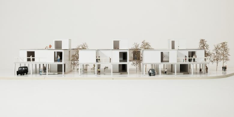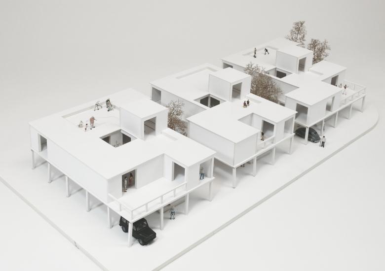 Die Gebäudekörper stehen auf Stützen. Der dadurch entstehende, weiträumig gedeckte, gemeinsame Aussenraum im Erdgeschoss bildet den Übergang vom öffentlichen Strassenraum zum privaten Wohnen und kann mannigfaltig genutzt werden - als Parkplatz, Werkstatt, Spielplatz, Hühnerhof, Gartenanlage, Veranda, etc.