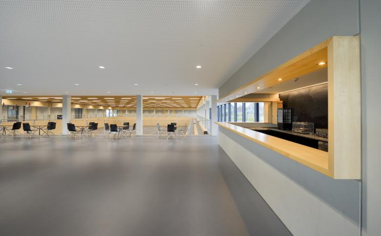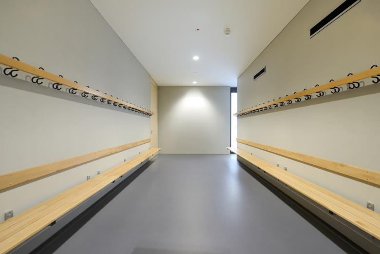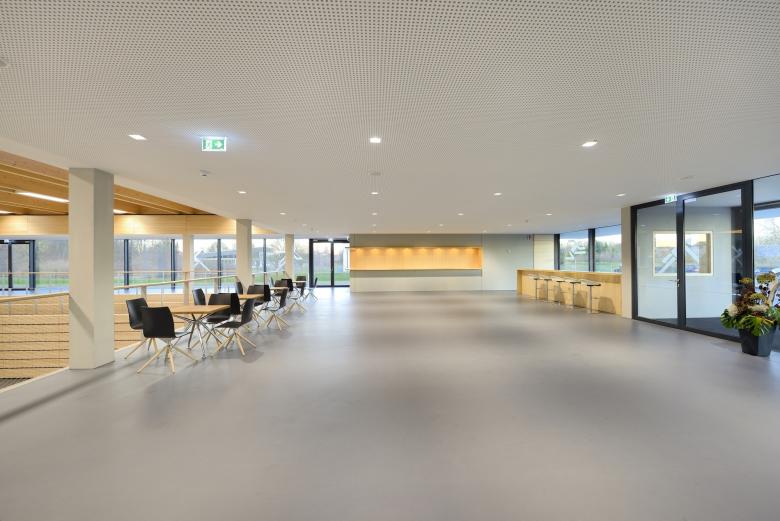 Auf der Eingangsebene sind drei Eingänge angelegt: Der Schülereingang von Nordwesten mit fußläufiger Anbindung an die Mittelschule, der Sportlereingang und der Zuschauereingang im Süden als Zugang vom Parkplatz. Die Zuschauer- und Tribünenbereiche werden über das Foyer schwellenlos angebunden. Die Spielfeldebene ist um die Höhe der Tribüne um ca. 3,25 m zur Zuschauerebene abgesenkt. Die Fest- und Teleskoptribünenplätze werden von den Besuchern über den Zuschauergang erreicht. Die Stehplätze befinden sich rund um die Halle entlang des arkadenartigen Stützenumgangs. Der Umkleidetrakt im Westen wird durch Sportler- und Schülereingang über einen Sportlergang erschlossen. Von den Umkleide- und Sanitärbereichen sind die drei Einzelhallen über drei Treppen zu erreichen. Im Untergeschoss sind neben dem Sportfeld mit Übermaß von 46 x 30 m u.a. großzügige Sportgeräteräume und Lagerräume für mobile Tribünen und Bühnen sowie Technikräume vorgesehen.