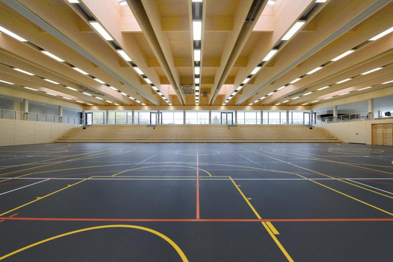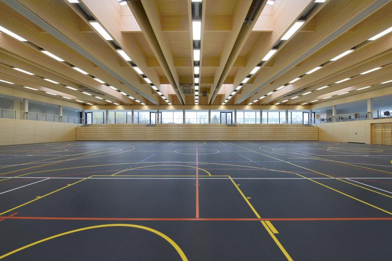 Die innovative Holzdachkonstruktion der neuen Halle ist aus konventionellen Brettschichtträgern und Mehrschichtplatten hergestellt. Der Achsabstand der Doppelträger-Konstruktion beträgt ca. 2,65 m, weshalb die Konstruktionshöhe mit 2 m trotz ca. 33 m Spannweite entsprechend gering gehalten werden konnte. Die Dachhaut wurde aus einer Holzmehrschichtplatte hergestellt, die gleichzeitig die fertige Untersicht ist. Auf eine zusätzliche Sekundärkonstruktion für die Dachhaut konnte dadurch verzichtet werden. Insgesamt wurde eine ressourcensparende und wirtschaftlich effiziente Bauweise gewählt. Die werkstoffgerechte Verwendung der nur 14 cm dicken vertikalen Brettschichtträgern und der 10 cm dicken horizontalen Mehrschichtplatten ermöglicht ein reduziertes Schwindverhalten. Zusätzlich wurden die Verbindungsmittel so gewählt, dass ein Schwinden in Querrichtung nicht behindert wird. Besonders innovativ ist, dass je zwei Brettschichtträger mit der Mehrschichtplatte zusammengefügt und mit vertikalen 1 m hohen Rippen stabilisiert wurden. Somit entsteht eine Trägerkonstruktion, die auch im Transport- und Einhubzustand ausgesteift ist, was die Montage deutlich erleichtert. Dadurch entstanden 18 modulare Doppelträger-Konstruktionen, die sehr schnell und sicher montiert werden können, da sie nicht zusätzlich ausgesteift werden müssen. Nach der Montage der einzelnen Träger auf die Lager, wurden die Bauteile miteinander kraftschlüssig verbunden und zu einer homogenen Dachscheibe ausgebildet, die das Dach stabilisiert. Das Dach der neuen Halle wurde innerhalb von nur drei Tagen Baustellenmontage wasserdicht geschlossen. Die termingerechte Fertigstellung wurde u.a. durch eine kurze Montagezeit des Daches erreicht. Die Vormontage im Werk erfolgte durch die modulare Bauweise effizient innerhalb einer Woche. Die gewählte Lösung ist eine robuste Konstruktion. Sie ist vollständig zugänglich und damit sehr gut zu warten und zu überprüfen. Eine gute Wirtschaftlichkeit in Unterhalt und Betrieb ist deswegen zu erwarten. Die Dacheindeckung mit einer 2%-Gefälledämmung und die planmäßige Überhöhung der Träger um 8 cm sichern eine dauerhafte Dachentwässerung. Auf jegliche Anstriche, insbesondere Brandschutzanstriche, des Tragwerks konnte entsprechend dem Brandschutznachweis, trotz Einstufung als Versammlungsstätte, verzichtet werden. Durch die in der Untersicht unauffällige und ruhige Trägerrostkonstruktion ohne Stabwerke, Fachwerkträger, Unterspannungen etc. werden Ablenkungen und Störungen der Konzentration der Sportler minimiert. Trennvorhänge und Leuchten verschwinden im Zwischenraum der Doppelbinder, Abhängungen von Geräten sind im eingeklappten Zustand aufgeräumt.