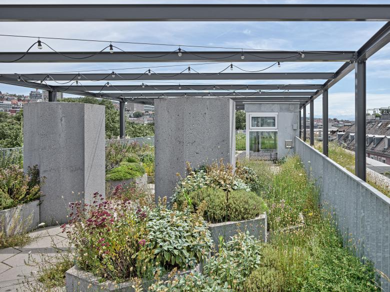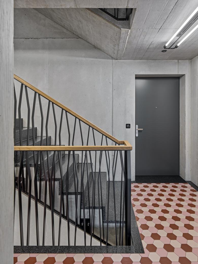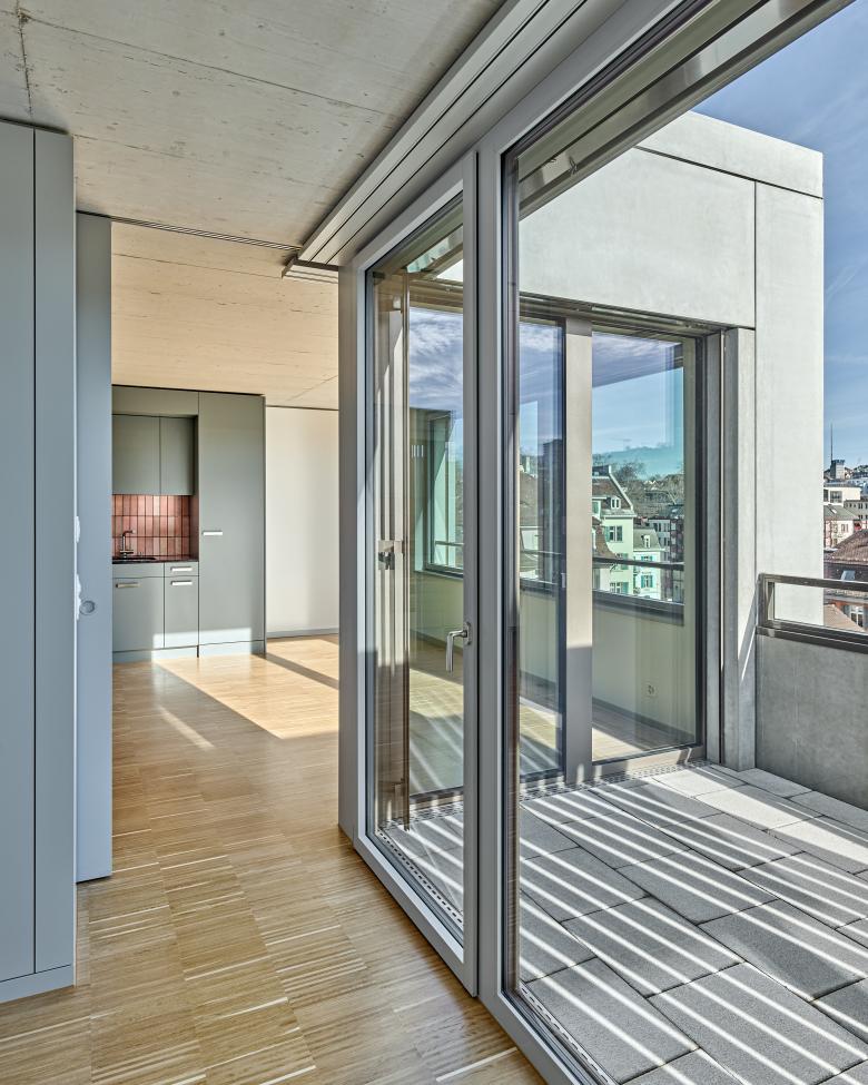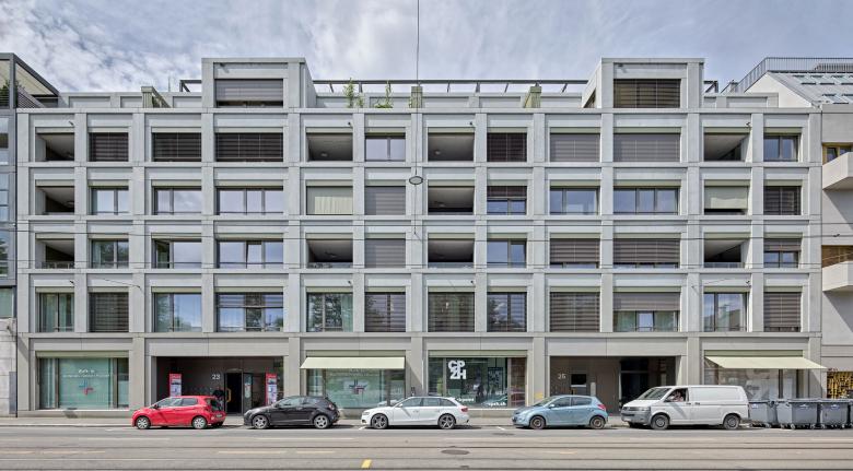 In der Aussensicht werden die Hof- und Strassenseite architektonisch differenziert behandelt, um auf beiden Seiten ein möglichst integratives Erscheinungsbild zu schaffen: Richtung Limmatstrasse wird der Strassenraum präzise gefasst und die quartiertypische Gliederung «überhohes Erdgeschoss, kompakte Regelgeschosse, akzentuiertes Dachgeschoss» umgesetzt. Auf der Hofseite entsteht aufgrund der Vor- und Rücksprünge eine kleinteiligere Wirkung, die einen wohnlichen Massstab und räumliche Schwerpunkte schafft.