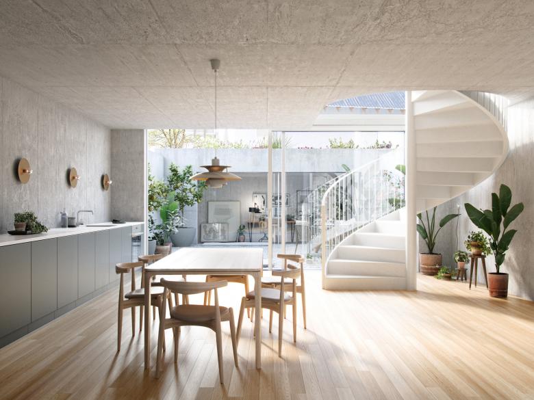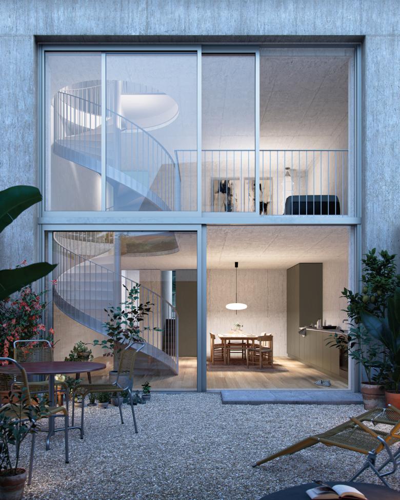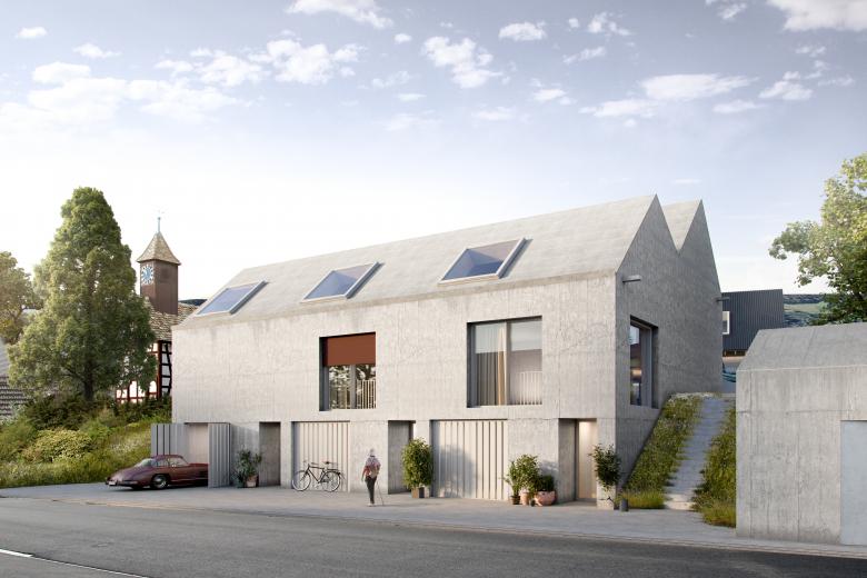 Der Bau schiebt sich in den Hang und ist geprägt von der höhengestaffelten Abfolge von Entrée, Küche und einem vielfältig nutzbarem Atelierraum, der via Innenhof zugänglich ist. Split-Level Geschosse schaffen vielfältige Räume. Ein zweigiebeliges Dach gliedert das oberste Geschoss und verleiht dem Haus zusammen mit der Sichtbetonfassade eine markante Gestalt.