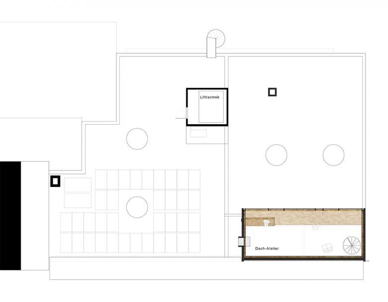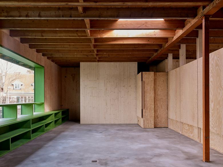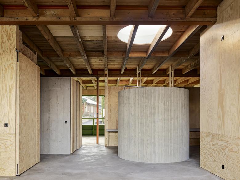 Innenwände werden entfernt oder mit Öffnungen versehen. Sind diese im Sommer geöffnet, entsteht ein grosser mäandrierender Gesamtraum. Die Halle des ehemaligen Ladens beinhaltet Raummöbel mit Bad, WC, Schränken und Gästezimmer, welche Raumnischen ausbilden und den Gesamtraum in einen Wohn- und Atelierbereich unterteilen.
