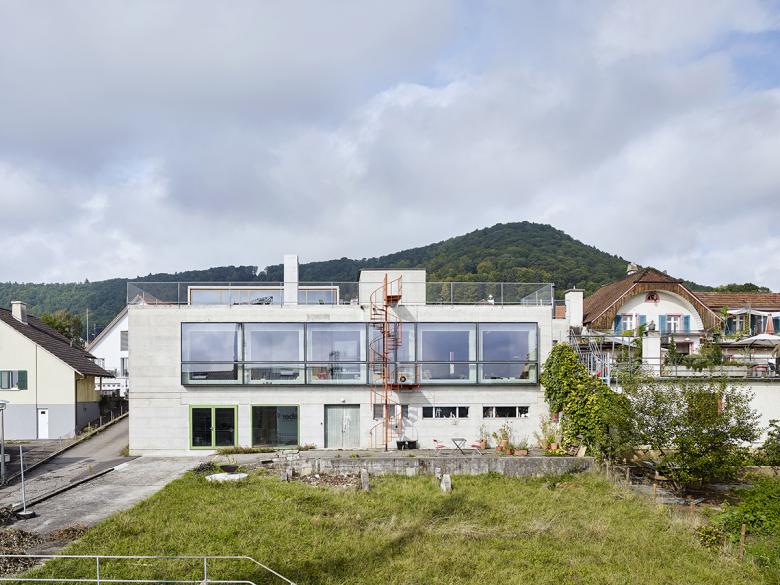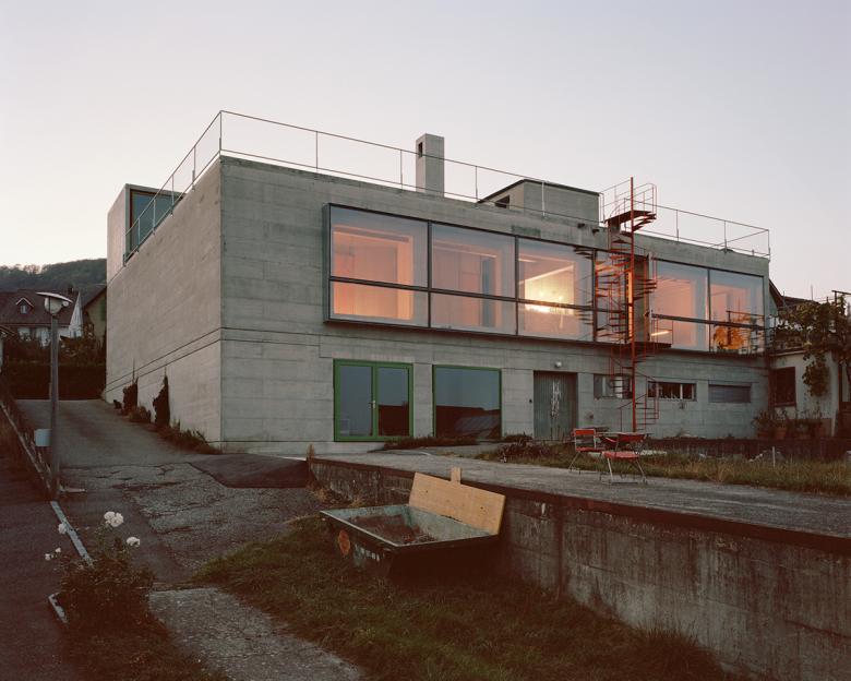 Eine Wohnung und ein Architekturstudio werden eingebaut. Anlieferung und Garage bleiben als Werkstatt erhalten, zusätzlich wird auf die Garage ein kleiner Aufbau gesetzt. Die Zweiteilung des Gebäudes wird talseitig den Fenstern entlang aufgehoben, zugunsten von einem sehr langen schmalen Raum, welcher Küche und Wohnen umfasst. Die bestehenden Fenster mit Brüstungshöhe 2.50m werden auf Sitzbankhöhe heruntergeschnitten. Vor diese Öffnungen wird aussen ein langer Fensterkasten aus Stahl gesetzt.