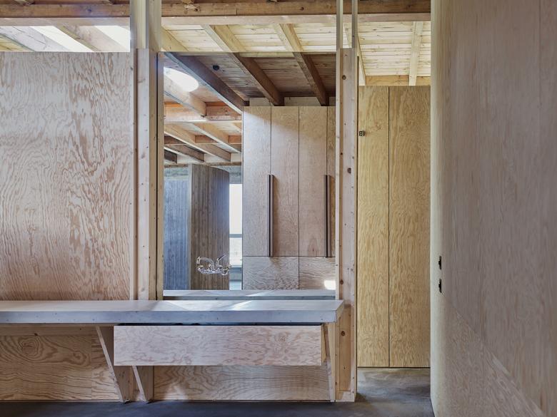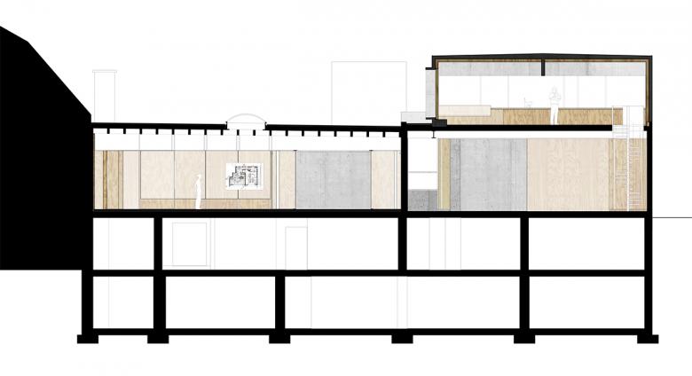 dadurch lediglich eine neue Zeitschicht hinzugefügt. Sämtliche Holzeinbauten und Türen werden mit dem Schreiner direkt auf der Baustelle gebaut. Feine präzise Detaillierungen stehen der rohen Unmittelbarkeit des Materials gegenüber.
