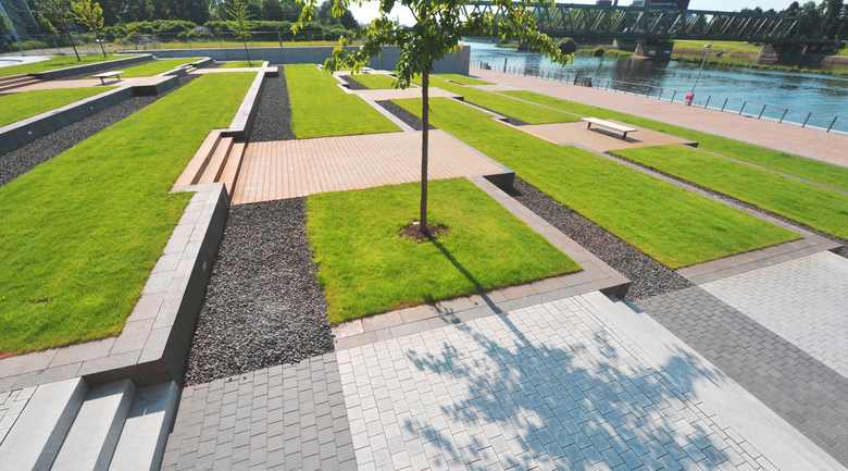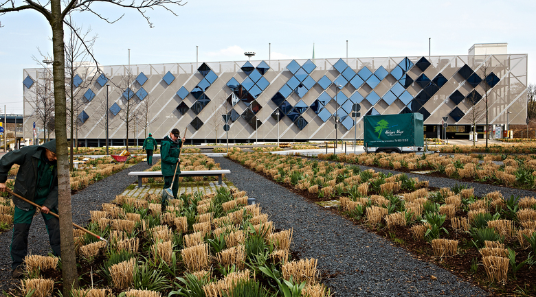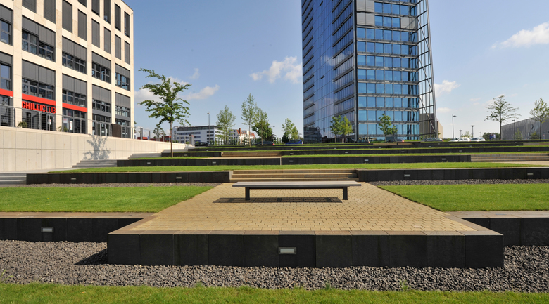 Auf dem Gelände einer ehemaligen Kaffeerösterei sollte die Landschaftsarchitektur für die heterogene Architektur eine gemeinsame gestalterische Grundlage schaffen und zur Identitätsbildung im Quartier beitragen. Das geometrische Grundgerüst einer durchlaufenden Bänderstruktur verbindet die unterschiedlichen Gebäude, ihre Typologien und ihre Nutzungen. Die Pflanzen werden zum atmosphärisch bestimmenden und raumbildenden Bestandteil des Quartiers. Sie stellen einen menschlichen Maßstab in dem weitläufigen Gelände und am Fuße des Hochhauses her. Sie bilden eine Verbindung zu den natürlichen Elementen der Region und des Ortes – Wind und Wasser – und verstärken deren Wahrnehmbarkeit im Stadtkontext. Im Uferbereich der Weser lädt eine abgestufte Terrassenlandschaft zum Sonnenbaden ein – die Terrassen können auch als „Lounges“ für die angrenzende Gastronomie oder als Tribüne für Veranstaltungen genutzt werden.