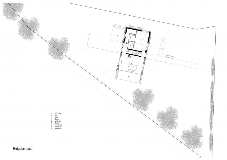 Das steile Hanggrundstück oberhalb der Kreisstraße zwischen Altusried und Kimratshofen wird über einen befestigenden Feldweg entlang der südlichen Grundstücksgrenze erschlossen. Die Ausrichtung des Wohngebäudes mit der Firstrichtung Nord-Süd basiert auf zwei wesentlichen Überlegungen: