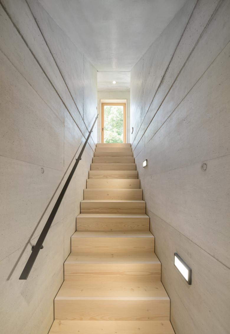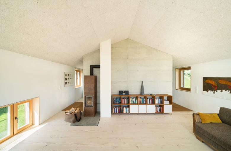Das Dach wurde als klassischer Pfettendachstuhl ausgeführt und erhielt eine farblich zu den PV-Modulen passende Blechdeckung. Die Sparrenlage wurde außenseitig mit Holzweichfaser, hinterlüfteter Schalung und Blecheindeckung versehen; raumseitig wurden die Sparren mit OSB- und Holzwolle-Leichtbauplatten bekleidet. Treppenhauswände, Treppe und Decke über UG wurden in Betonbauweise hergestellt und tragen zur Aussteifung des Gebäudes sowie der Speicherung innerer und solarer Gewinne bei.