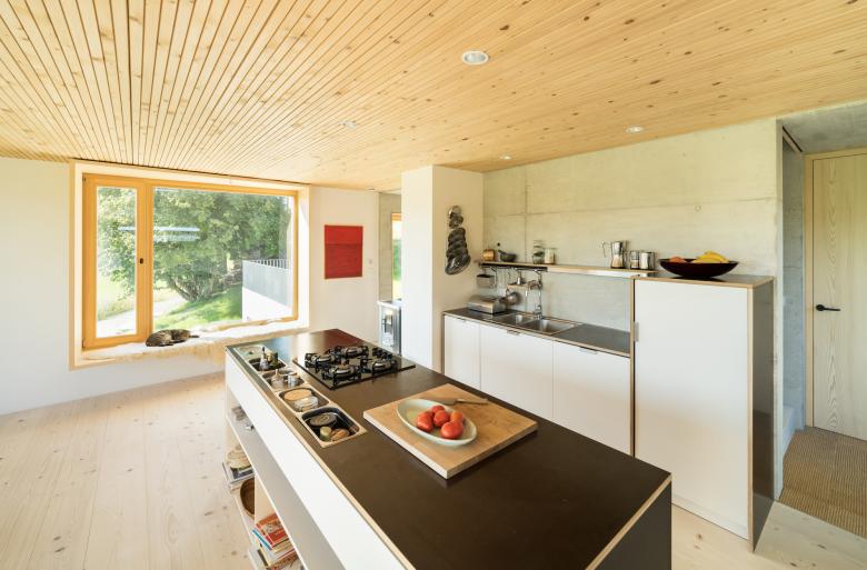 Die Wärmeerzeugung erfolgt in beiden Geschossen über handbefeuerte Stückholzofen in Wohnraum und Küche. Die Schlafbereiche bleiben Kaltbereiche.