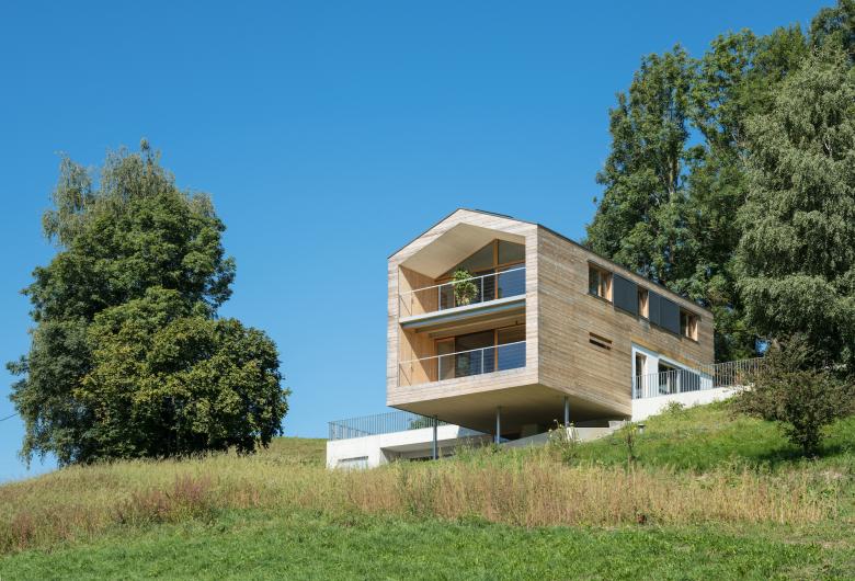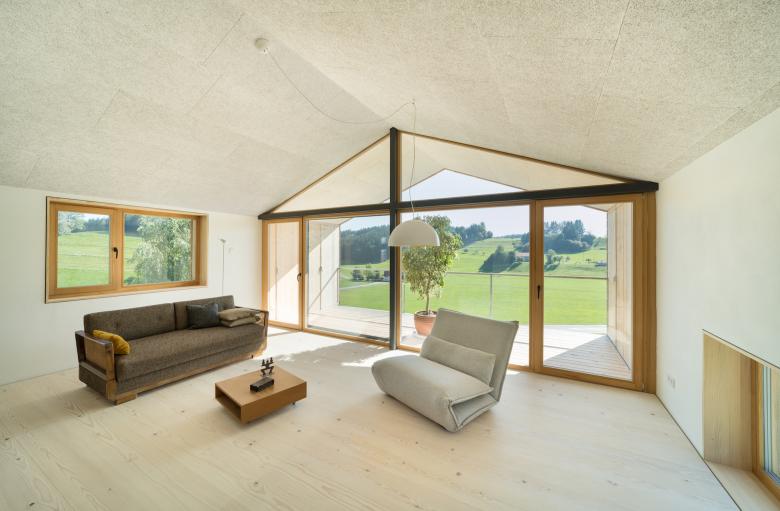 Holzkonstruktion, Holzschild und Bodenbeläge im Haus wurden aus heimischen Hölzern hergestellt, um die Wertschöpfungsketten zu stützen und so einen Beitrag zur Nachhaltigkeit zu leisten.