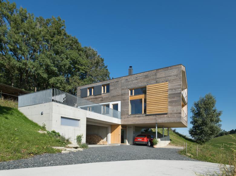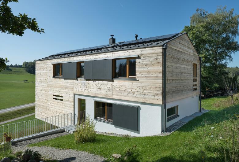 Das Gebäude wurde in Mischbauweise erstellt. Die erdberührten Bauteile wurden vor Ort betoniert, außen gedämmt und, wo sichtbar, verputzt. Alle anderen Wände des Wohngebäudes sind in konventioneller Holzständerbauweise mit Zellulosedämmung errichtet. Außenseitig sind die Ständer mit Weichfaserplatten überdämmt und mit einem hinterlüfteten Holzschild mit liegender Schalung aus Weißtanne versehen. Die innenseitige Beplankung der Ständer besteht aus OSB-Platten zur Aussteifung, auf die Putzträger aus Gipsfaserplatten und Lehmputz aufgebracht wurden.