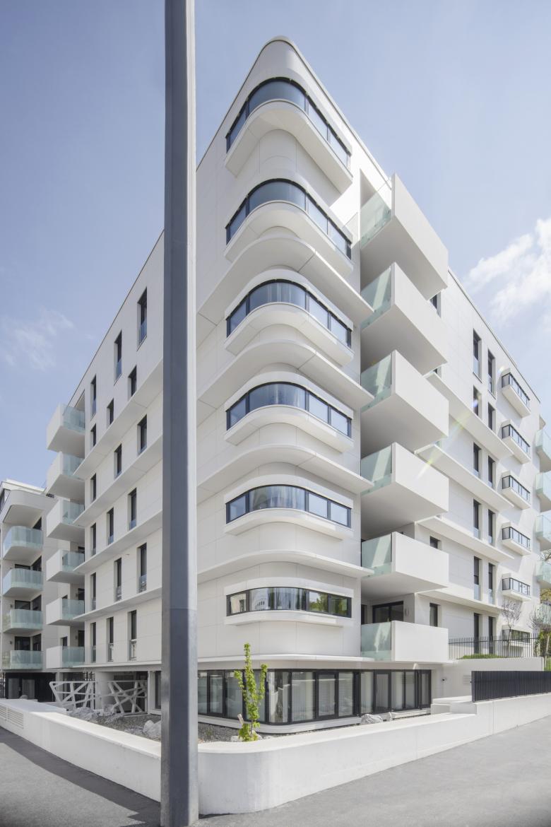 Die gesamten Fassadenflächen wurden mit Faserzementtafeln in Großformaten verkleidet. Absolut einzigartig sind die gerundeten Gebäudekanten mit einem Radius von ca. 80cm, die mit gekrümmten Sonderelementen verkleidet wurden, wodurch die einzelnen Fronten fließend ineinander übergehen. Ausschlaggebend für die Materialwahl waren die Faktoren Hochwertigkeit, Langlebigkeit und Nachhaltigkeit.