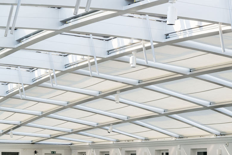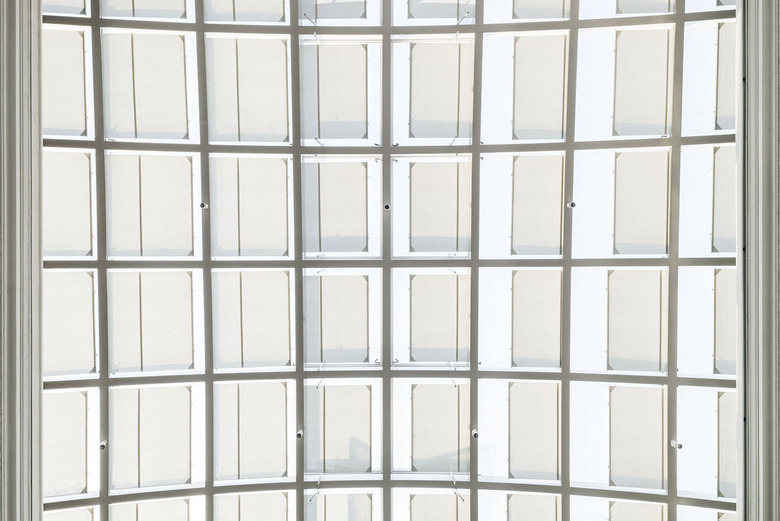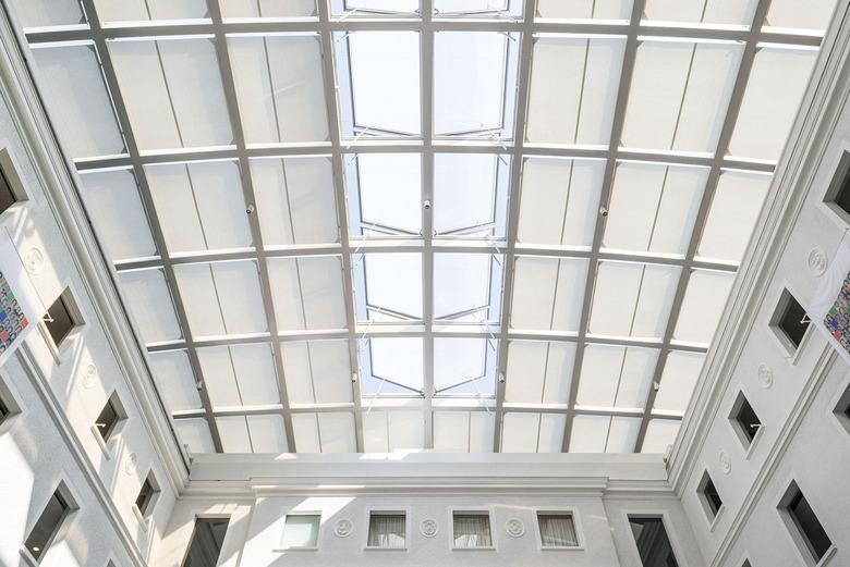 Das Glasdach ist in der Form eines abgeschnittenen Ellipsoids gebaut. Dadurch sind insbesondere in den Ecken die Felder über die Diagonale „verzogen“. Der innenliegende Sonnenschutz ist dieser Form angepasst eingebaut und ist dadurch in sich über die horizontale Diagonale verdreht angebracht