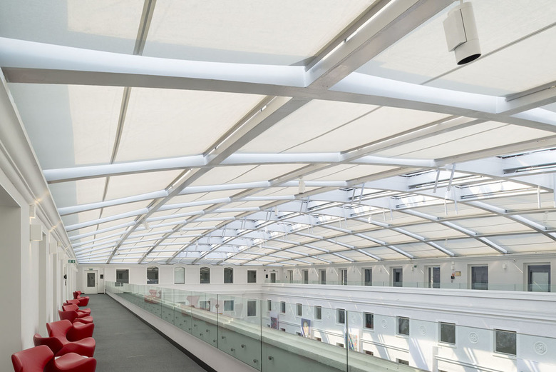 Beim Teilprojekt „intra-muros“ wurde der bestehende Innenhof mit einem riesigen Glasdach geschlossen. Unter der gewölbten Dachkonstruktion sind in den einzelnen 104 Feldern SUNLUX® 4500 eingebaut.