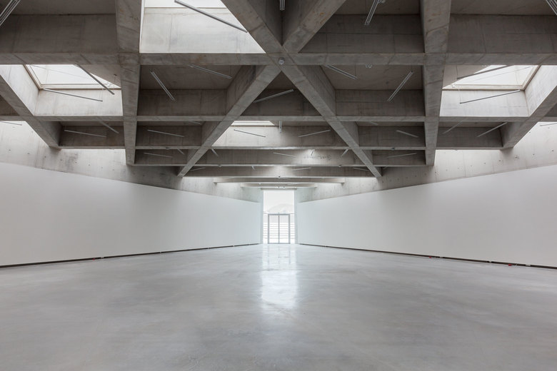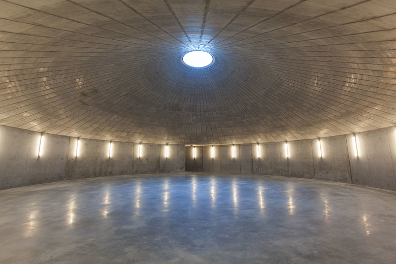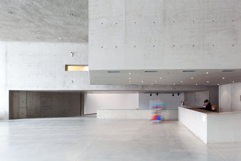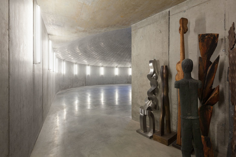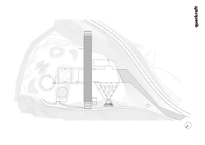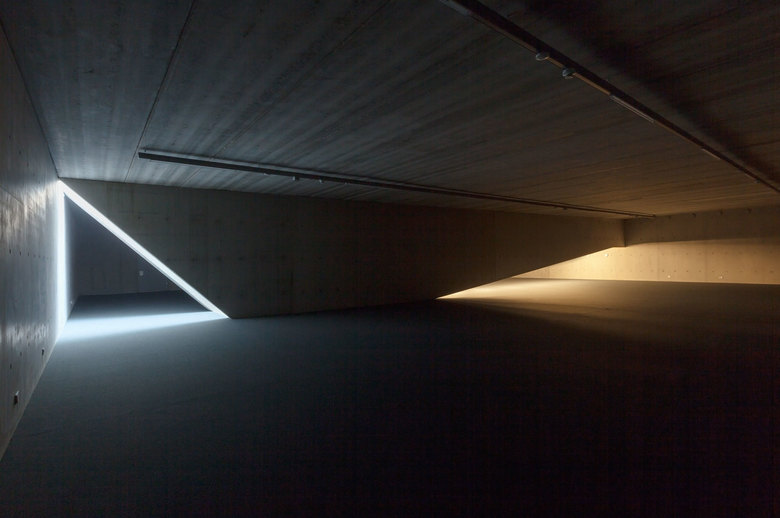 Antwort – Aus Kostengründen und zur Optimierung des Energiekonzepts liegen 95% der Kubatur unterhalb der Erde - der Erdaushub wurde auf dem Grundstück verteilt. Man betritt das Museum über das großzügige Schaudepot, den "Weinkeller der Kunst" und erreicht die helle Haupthalle an zentraler Stelle. Als Gegenpol zur kontemplativen Kunstbetrachtung finden die Besucher dramaturgische Höhepunkte durch die intensive Fokussierung auf die Landschaft. Niemals entsteht der Eindruck, sich unter der Erde zu befinden. Auch bei der Erweiterung des Museums wurde mit der Topographie der Umgebung gearbeitet.