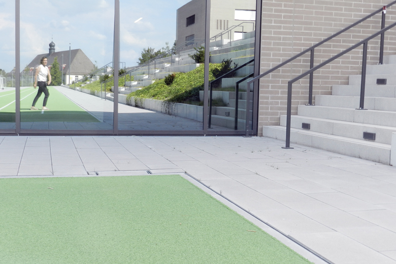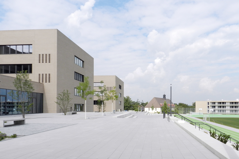 Der Vorplatz auf dem die Baukörper stehen, die drei höhengestaffelten Pausenhöfe, die jeweils einem Gebäudeteil zugeordnet sind, sowie dem auf der unteren Geländestufe angeordneten Sportbereich. In Nord–Süd Richtung kann der Schulcampus barrierefrei durchquert werden. Sitzstufen fassen die einzelnen Pausenhofbereiche, führen den Blick in die Landschaft und vermitteln zu den tiefer gelegenen Sportanlagen.
