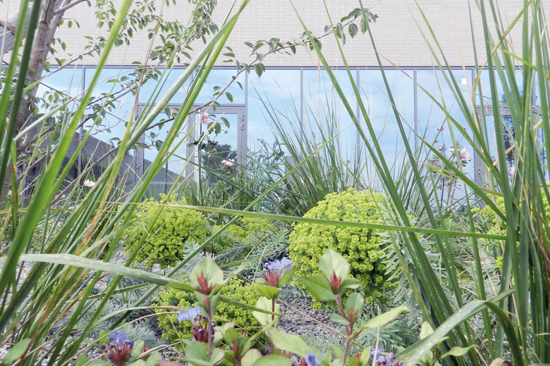 Fahrradabstellanlagen und Stellplätze sind den Gebäuden zugeordnet. Altbaumbestand konnte erhalten werden. Proportionen, Bepflanzung, Farb- und Materialwahl der Aussenanlagen ist abgestimmt auf den Hochbau.