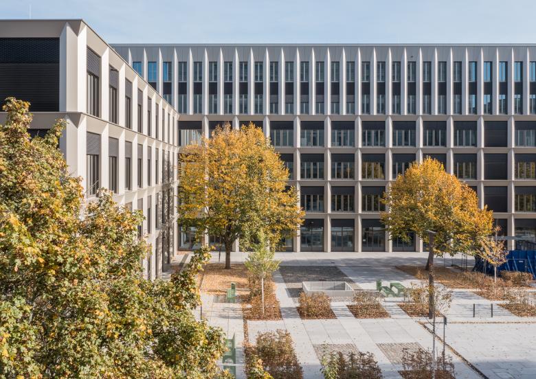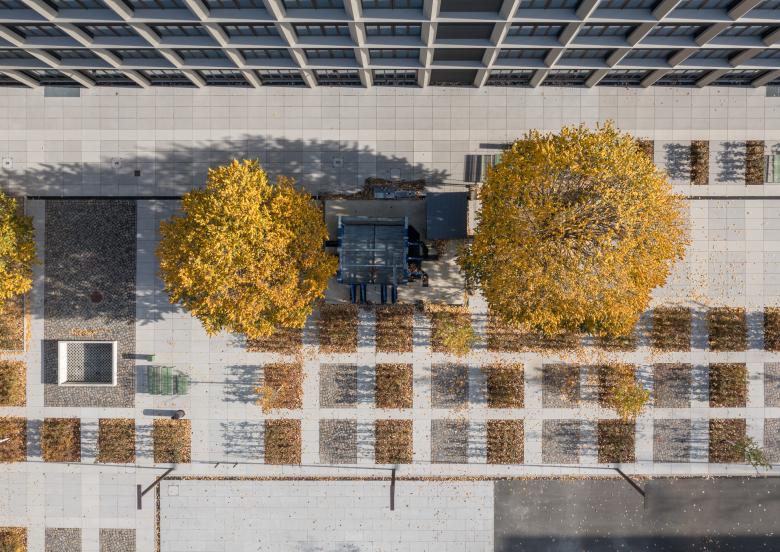 Obwohl zahlreiche Bäume für den Neubau und die umfangreiche Medienverlegung gefällt werden mussten, konnten im Hof einzelne große Bestandsbäume erhalten werden. Dazu gehört eine große Robinie und drei Silber-Linden. Sie werten gemeinsam mit den grünen Kuben der Heckenblöcken und den Neupflanzungen den Innenhof nachhaltig auf.