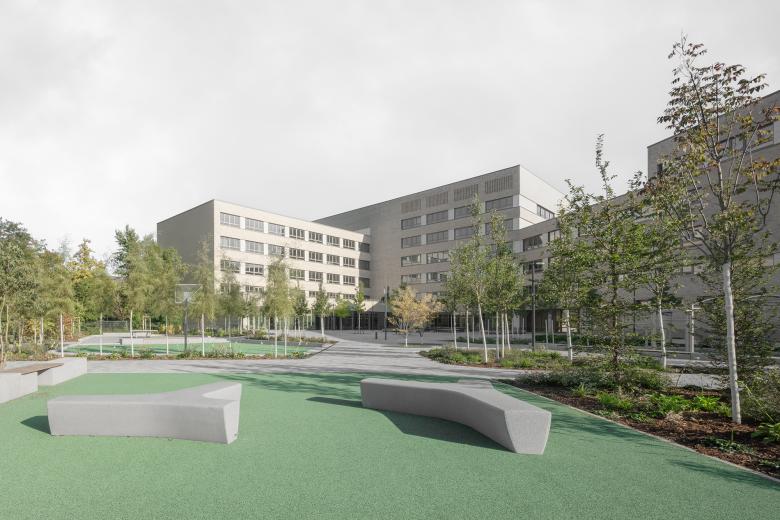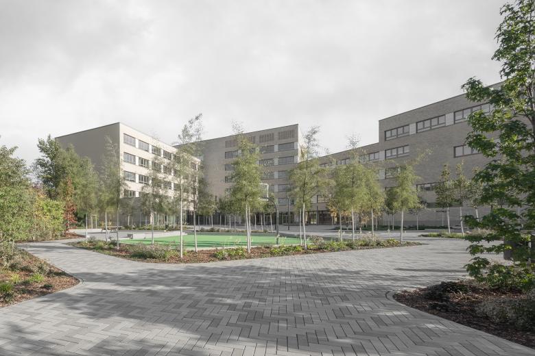 Die Freiflächen werden in die drei Bereiche gegliedert: Schulfreiflächen, Sportanlagen und öffentliches "Grün". Durch die gestalterische Setzung von "Grünen Kabinetten" als wiederkehrendes Motiv wird das Planungsgebiet zu einer eigenständigen und für das Quartier identitätsstiftenden Einheit zusammengeführt.