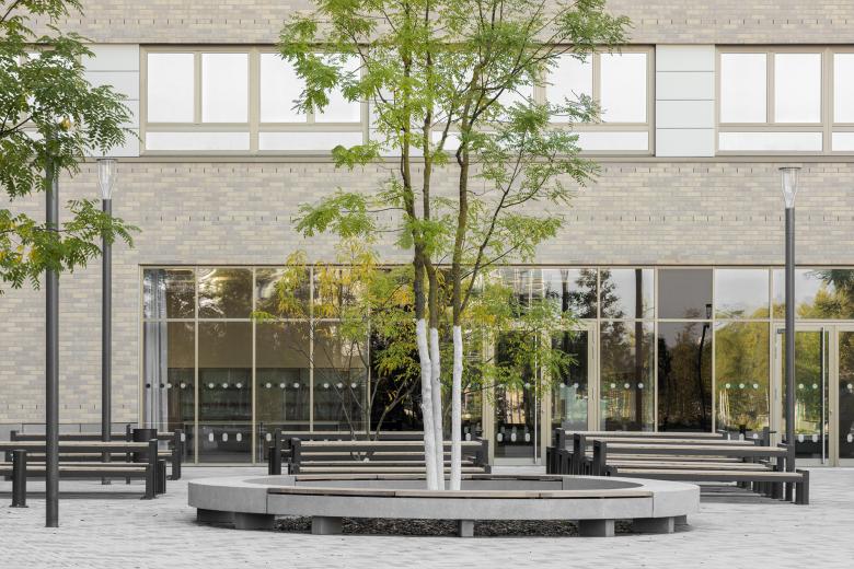 Ein im Kreuzungsbereich befindliches Biotop mit seinen kapitalen Solitärgehölzen wurde weitestgehend erhalten, gesichert und gestalterisch in die Gesamtmaßnahme integriert. Ein funktional aufeinander abgestimmtes Nebeneinander von befestigten und unversiegelten Flächen prägen das zukünftige platzartige Entrée sowie die Pausen- und Hofflächen.
