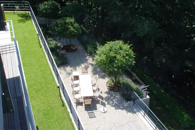 Das 2.800 m² große Grundstück befindet sich circa 11 km östlich des Dresdner Stadtzentrums unmittelbar an den Elbhängen und entwickelt sich über 30 Höhenmeter hinab in das Dresdner Elbtal. Die Zusammenführung gezähmter und ungezähmter Natur, sowie die Verknüpfung bestehender, historischer Elemente mit modernen, schlichten Implantaten standen bei dem Entwurf am Steilhang im Vordergrund. Die mit unterschiedlich Funktionen versehenen, sich in den Hang schiebenden Terrassenplateaus, sind durch Treppenanlagen miteinander verbunden und fügen sich in schlichter Eleganz zu einer modernen Gartenanlage.