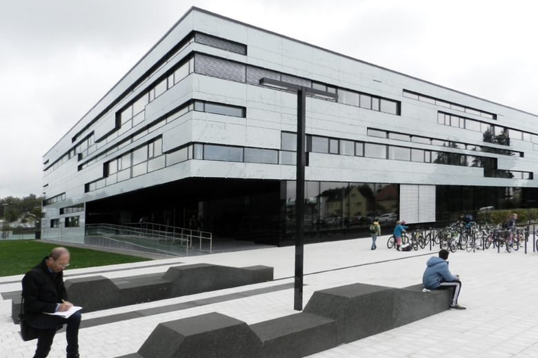 Die Außenanlagen für den Neubau der staatlichen Realschule gliedern sich in drei Bereiche, den durch das Gebäude gefassten Pausenhof, den linear ausgerichteten und kompakten Sportbereich, sowie den Vorplatz auf dem die Baukörper stehen. Der Pausenhof versteht sich als Kontinuum des Schulgebäudes. Die hell gepflasterte Fläche ist durch Plattenstreifen und Sitzgelegenheiten gegliedert, die sich aus dem Fassadenspiel ableiten. SolitärBäume markieren den Hof und die Freifläche. Umgeben ist die befestigte Pausenhoffläche von Aufenthaltsbereichen die durch Hecken gegliedert, dem Spiel, dem Lernen und der Erholung dienen. Die Sporthalle und Sportfelder grenzen alle an die Nordsüd verlaufende Erschließungsachse, die mit einer Baumreihe aus Säuleneichen gekennzeichnet ist. Der Vorplatz mit Eingangsbereich und Erschließungsflächen stellt sich als gepflasterte und funktional gegliederte Fläche den gestellten Anforderungen.