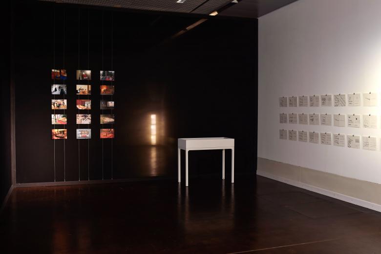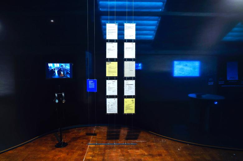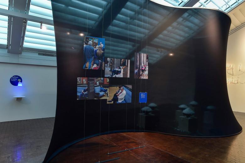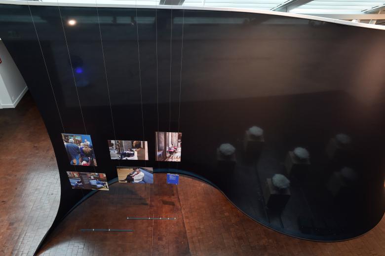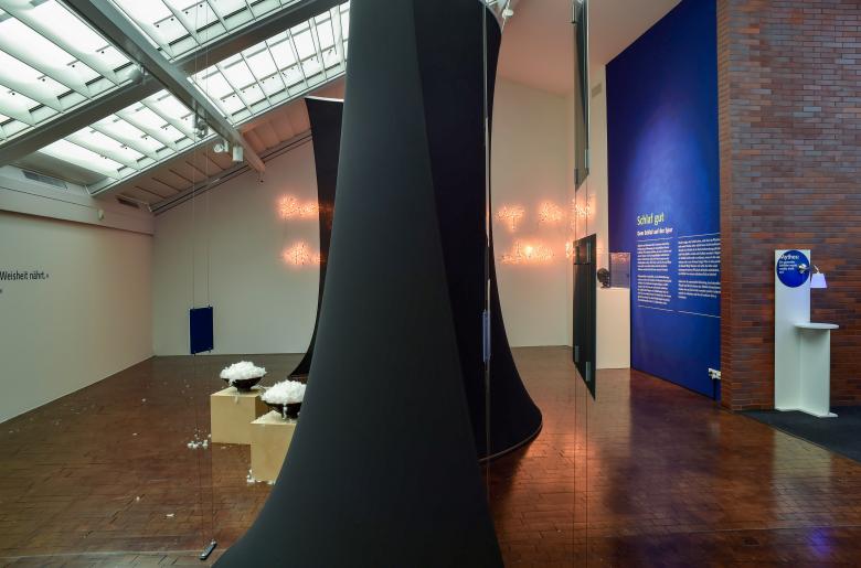 raumprodukt kreiert für diese Ausstellung eine textile Struktur, die den Raum in rhythmischen Wellen durchspannt. Aufgrund der bogenförmigen Fassung des Textils und dessen Verspannung entstehen kokonartige Nischen, die die Exponate aus Kunst und Wissenschaft bergen und umhüllen.