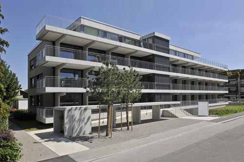 Die Wohnungseingänge ab diesem Aussenraum führen in die gemeinsamen Wohn- und Essräume. Die Sanitärräume liegen in der Mittelzone. Alle Zimmer sind vom Bahnlärm abgewandt konsequent auf der Rückseite aufgereiht.