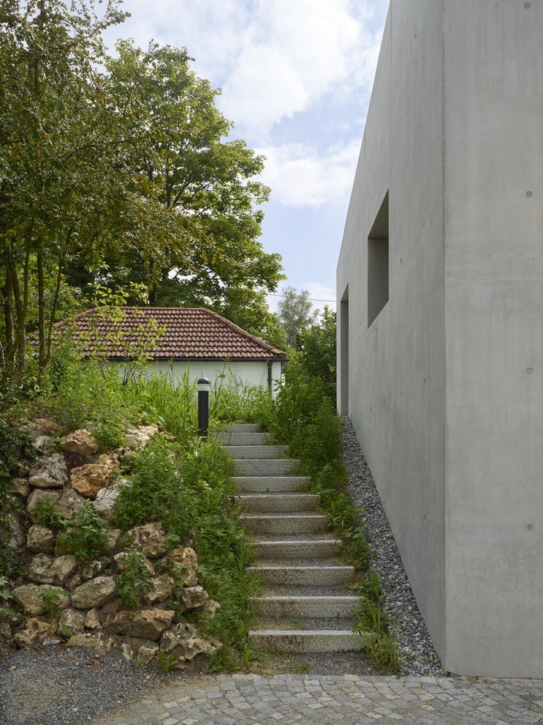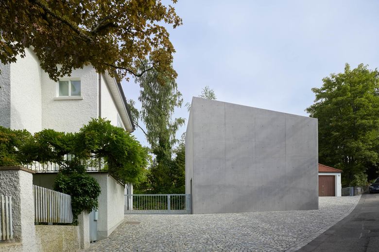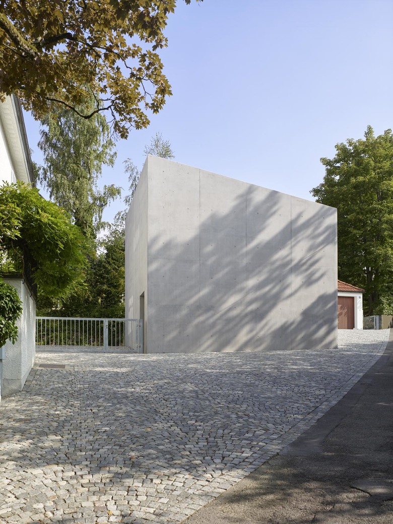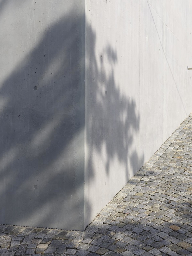 Das abstrakte Sichtbetongebäude steht in bewusstem Kontrast zum figurativen Erscheinungsbild der Bestandsvilla. Die abstrakte Form wird dabei lediglich über präzise Öffnungen mit tiefen Laibungen zum Einbringen von Archivgegenständen bzw. zum Ausblick in den rückwärtigen Garten unterbrochen. Der Konstruktionsprozess erlaubt den kompletten Betoniervorgang der tragenden Fassade an nur einem Tag und unterstreicht dadurch das einheitliche, architektonische Konzept mit einer skulpturalen Haltung gegenüber Form, Material und Detail.