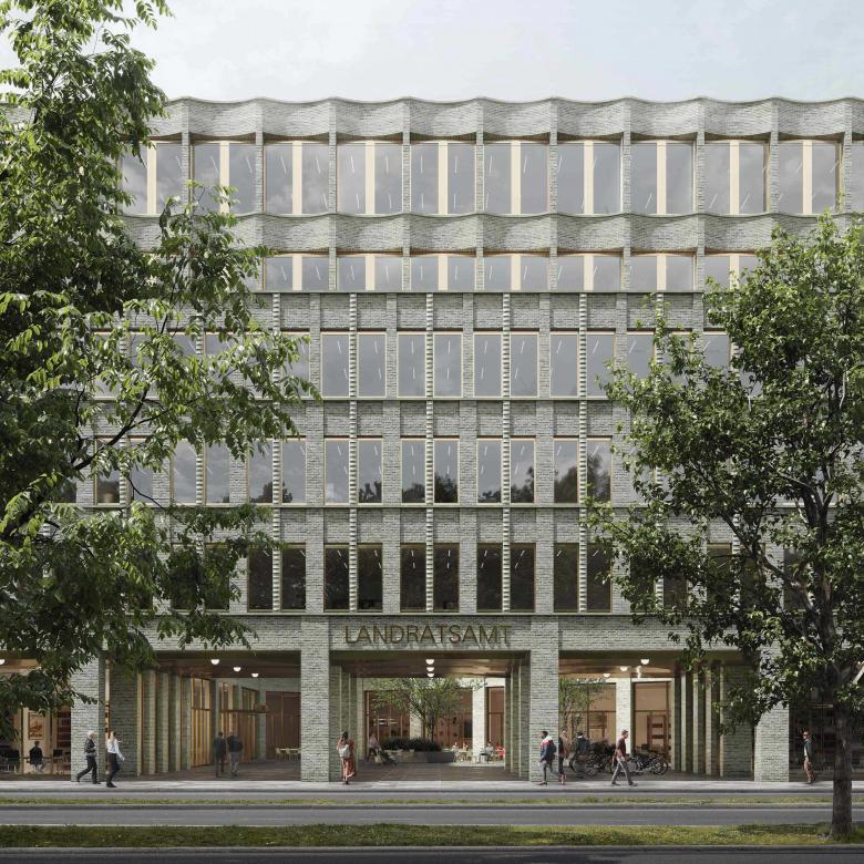 Zwei ineinander verschränkte, aus den Straßenfluchten entwickelte Baukörper mit eingeschnittenen Höfen sind über doppelhohe Staffelgeschosse bewusst in der Höhe gebrochen, um das große Volumen durch seine baukörperliche Differenzierung in den Kontext zu integrieren und dem Landratsamt durch seine Schnittfigur des markanten Giebelendes Auftakt und Gesicht zu geben. Die städtebauliche Figur generiert im Zusammenspiel mit einer wertigen Fassade ein Gebäude mit öffentlichem Charakter und städtischer Präsenz. Die vertikale Struktur des Sichtmauerwerks bildet dabei eine um das Gebäude umlaufende Ordnung mit einem spielerischen Relief aus Licht und Schatten.