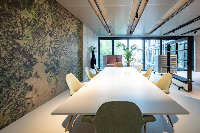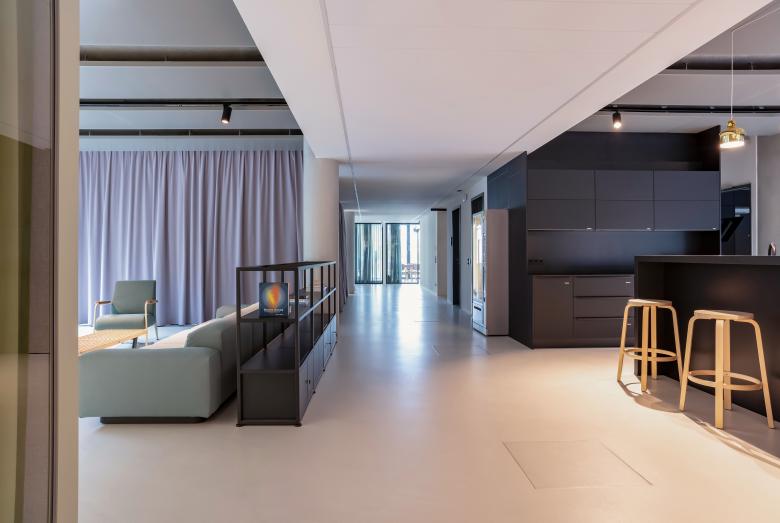 Eine weitere Besonderheit stellte die Hanglage der Max-Urich-Straße dar. So erhielt das Gebäude von uns zwei Erdgeschosse und eine interne Treppe als Verbindung. Während die Obergeschosse mit modernen Büroflächen in vielfältigen zeitgemäßen Formen ausgestattet sind, gibt es in EG1 und 2 ein Café und einen großen Küchenbereich zur Selbstnutzung, einen Fitnessbereich sowie Veranstaltungsräume mit Bühne und Bar – alle nur intern für die Mieter.