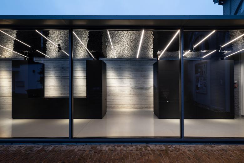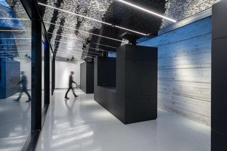Die Innengestaltung des Foyers überrascht sowohl gestalterisch wie funktional. Ästhetisch sorgen eine rohe Sichtbetonrückwand, ein heller, glatter Estrich und eine reflektierende Decke aus gelochten Edelstahlblechen mit eingelassenen LED-Linien für spannende Kontraste und Reflektionen. „Als funktionale Elemente haben wir drei raumhohe Einbaumöbel entwickelt, die gleichzeitig die Gebäudestützen verkleiden“, erzählt Christian Hein. Das mittige Möbelstück bildet einen multifunktionalen Empfangstresen, der nicht nur zwei integrierte Getränkekühlschränke und Schwerlastschubladen für Getränkekisten enthält, sondern auch auf beiden Schmalseiten durch ausziehbare Teile erweitert werden kann. Die beiden äußeren Möbel dienen als Garderoben – und können auf ihren Rückseiten als Galerieflächen für Ausstellungen genutzt werden.
