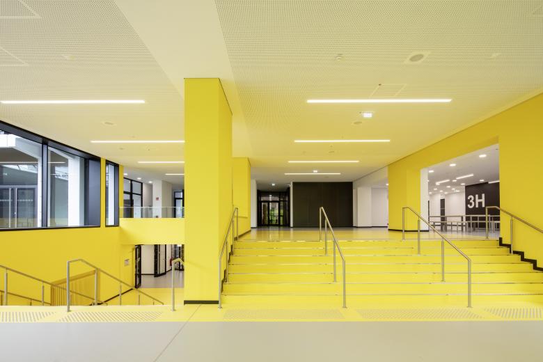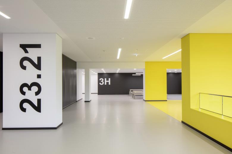 Das gestalterische Grundthema des Hell-Dunkel-Kontrasts setzten wir auch in den Innenräumen fort – ergänzt um markante Akzente in Gelb sowie hellem Ahornholz. So betreten die Nutzerinnen und Nutzer das Gebäude durch einen gelben Windfang inklusive gelb getönter Scheiben, auch ein Großteil des Entrees wird durch gelbe Böden und Wände geprägt. Von hier aus schließen sich eine Magistrale als Querverbindung, sowie die Hörsäle an. Diese sind durch weiße Wände mit diversen schwarzen Flächenanteilen und einer großformatigen Beschriftung in klarer Typographie gekennzeichnet. Gerade vor Seminarräumen oder den verschiedenen Hörsaal-Eingängen haben wir Aufenthaltsinseln eingestreut, die sich durch einen kontrastierenden dunklen Bodenbelag gegenüber der allgemeinen hellgrauen Beschichtung mit eingestreuten Silberflakes abheben. Besondere Highlights sind die Hörsäle.