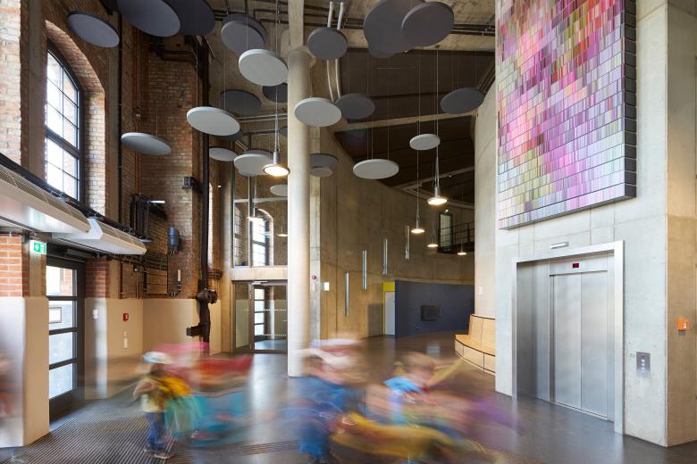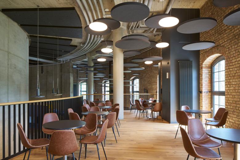 Auch das Farb- und Materialkonzept kombiniert industrielle Tradition mit moderner Ästhetik. Beispielsweise führten wir alle Installationen an der historischen Außenwand-Innenseite als Sichtinstallationen aus, in Kupfer oder Schwarz auf Ziegel-Hintergrund. Dazu passen robuste Böden aus geschliffenem Gussasphaltestrich oder einem Eiche-Stirnholzparkett ebenso wie erhaltene Infrastruktur, etwa die alte Füllstandsanzeige oder die nun ins Moderne übertragenen Wartungsumgänge an den Treppenhausfenstern. Farblich abgestimmte, runde Akustikelemente schweben wie Planeten über dem Café-Würfel mit seiner Terrasse, auch die eingestreuten linsenförmigen Leuchten wecken astronomische Assoziationen. So entsteht ein Ort, der zeitgemäße Bildung mit wertschätzender Wiederbelebung der Geschichte verbindet.