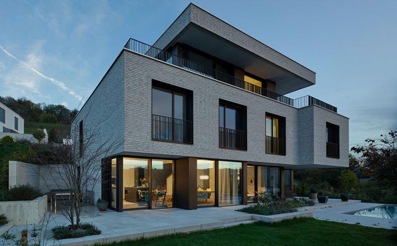 Die eindrückliche Aussicht in die Rheinebene zu den Vogesen und das Ergolztal bestimmen die Ausrichtung der Räume. Sockel-, Erdgeschoss und Attika können dank der Neigung des Hangs davon profitieren. Die drei Geschosse sind durch eine durchlaufende Eingangshalle miteinander verbunden.