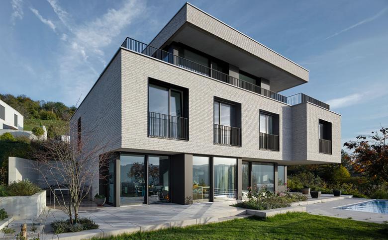 Eine jeweils einläufige Treppe führt vom Eingangsgeschoss zum Wohnzimmer im Sockelgeschoss hinunter und zum Elternschlafzimmer im Attikageschoss hinauf. Dem Wohn-/Esszimmer und der Küche vorgelagert erstreckt sich der Garten und der Pool auf verschiedenen Ebenen