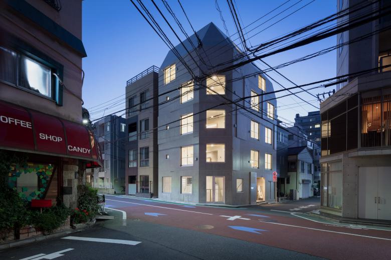 東京の中心、港区白金に建つ集合住宅・店舗・事務所の複合ビルのプロジェクトである。敷地は、古川の南に延びる五の橋通りの四差路角地に位置する。