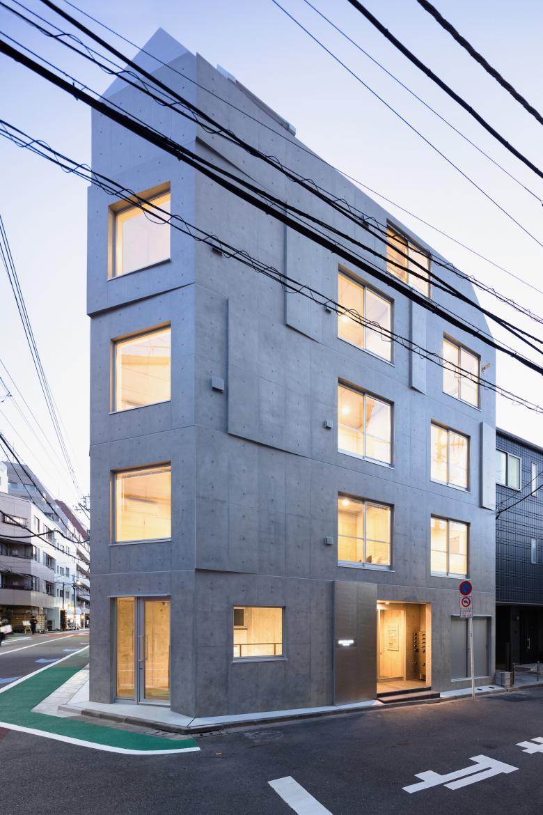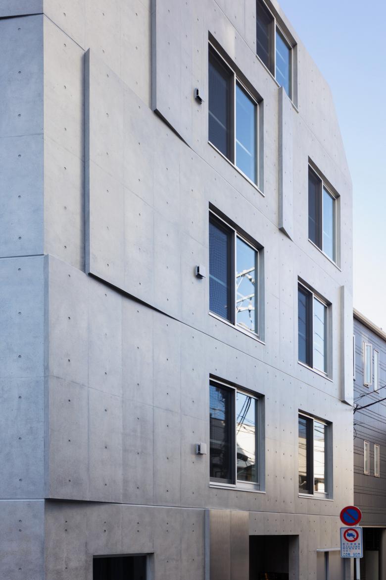 五の橋通りは昔ながらの商店街の雰囲気を持つ通りでありながらも道幅は狭くはなく、建物ファサード2面を引きで見ることができる。それ故、街角のアイコニックな存在となるようデザインを意識した。壁式RC造5階建ての計画で、外装はコンクリート打放し壁でコンクリート面が揺らぎを見せるように渦巻状に所々シフティングしている。この揺らぐコンクリート面のファサードデザインにより、路上に落ちる影も変化に富み、季節、時間で様々な表情が見られる。また、エントランスに設けたステンレスバイブレーション貼り壁面も角度を持たせることで、天候や、四差路を行き交う車や自転車、人々を多く映し出す。白金の賑やかな街に相応しく、またその活気を映し出すひとつの世界を、街の人々や居住者が垣間見られるデザインとした。