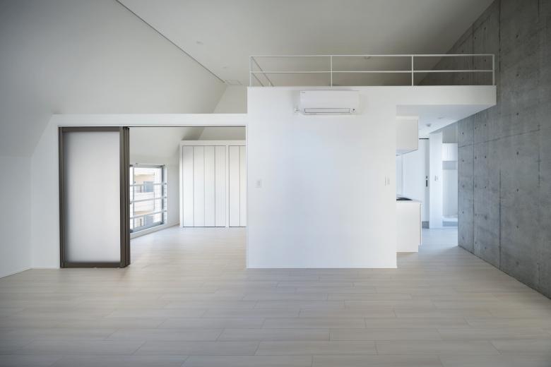 また天井高さを3.7Mとしたロフトスペース 付きメゾネットタイプの事務所は、居住も可能な空間とした。メインフロア、ロフトスペース 、ミーテイングスペース、キッチン、収納室、ユニットバス、屋外テラスにより多様な屋内外の空間を享受できる。ミニマリズムを基調に、素材と大らかな空間構成により、豊かさや居住者が主人公となるライフスタイルを提案している。