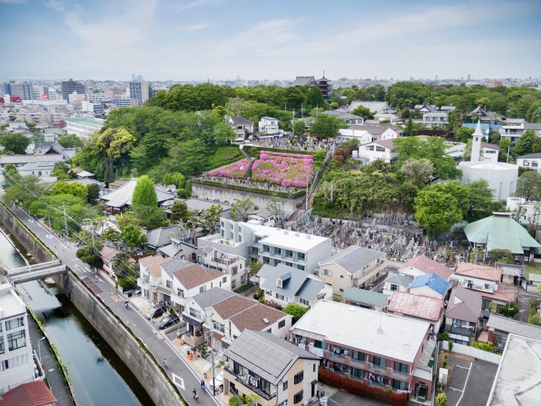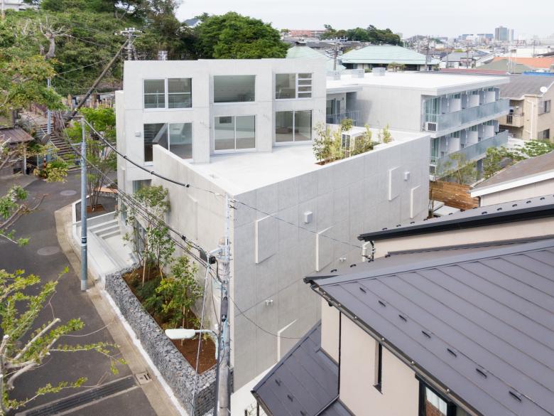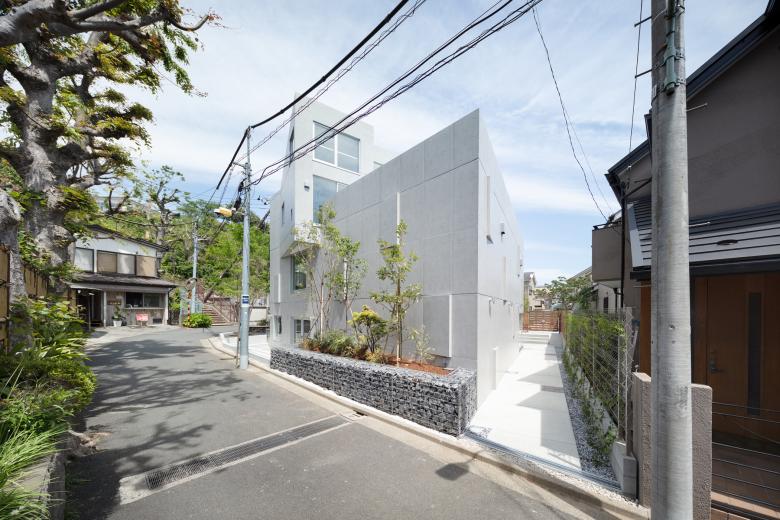 東京の南側、五重塔でも知られる池上本門寺の麓が敷地である。この地に居住しながら音楽練習、勉強、鑑賞、創作、発表も出来る多様な音楽生活の活動空間構成を提示すると同時に、建築空間が時間、利用いよって異なる構成がハイブリットに組み合わされる新たな建築の構成を計画した。建物形状は、この敷地のジオメトリに沿って拡がりをもたせた形状とし、西南部分に計画した音楽ホールを内外で回遊する空間をつくり起伏のあるランドスケープ空間としてアプローチ・ホワイエ・エントランスホールを形成している。この回遊空間上部に南北軸にずらした山なりの地形を感じさせるボリューム形状の居住空間がまたがる形とした構成がこの施設の象徴でもある。回遊空間から一歩奥に入ると、参道の主階段を彷彿させるような象徴的なメインアプローチ階段を設けており、防音賃貸住宅、オーナー住宅のプライベートなゾーンを計画している。