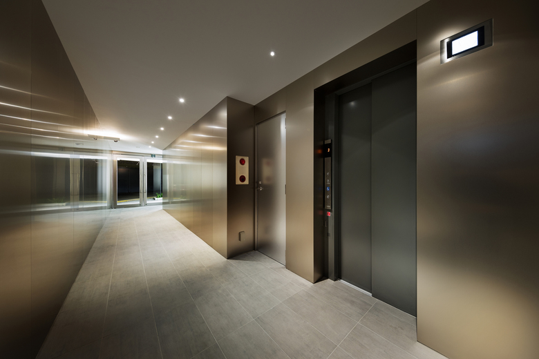 物エントランス、各階のコアをコンパクトに形成し、テナントスペースに面積