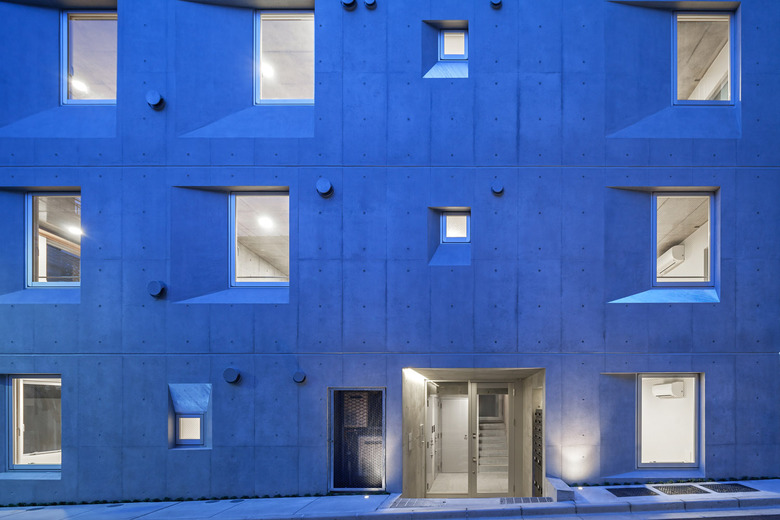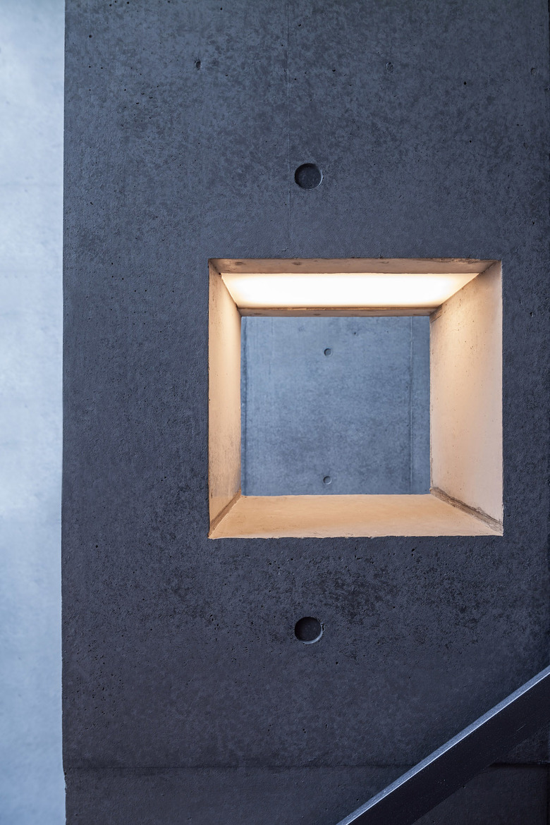 敷地周辺は細い道路を介して戸建て住宅が立ち並ぶため、近隣住民との視線交錯を避けるように開口を少しずつシフトさせた。この開口配列により光や風、風景を取り込みつつコンクリートという重たい素材に軽やかさを与えた。