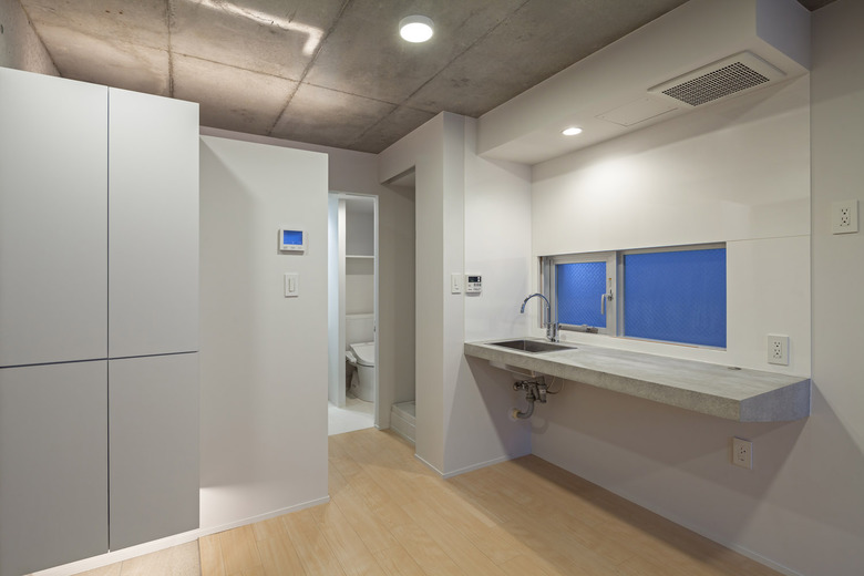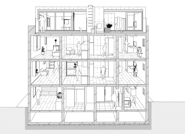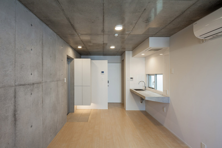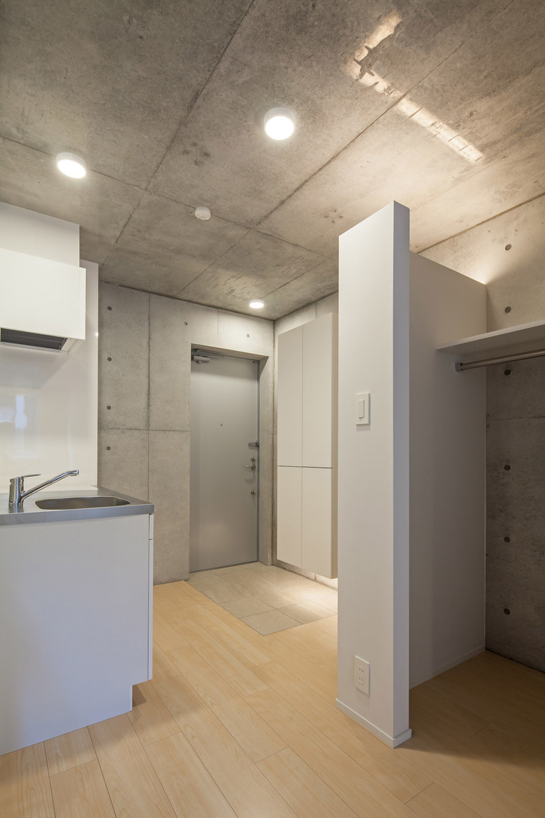 住戸内部は白い壁とコンクリート打放しだけで構成。無駄をそぎ落としたシンプルなディテールと仕様を徹底した。集合住宅に於ける最小限の形を追求し、モノに支配されない豊かさ、持たない生活の形、つまりライフスタイルと直結したミニマリズムを提案した。提供された最小限の要素は、住み手の自由な暮らし方のきっかけとなるだろう。例えば自立壁だけで仕切られた収納スペースはコンパクトな書斎にもなるし、広いコンクリートのキッチンカウンターはデスクなどにも利用できる。