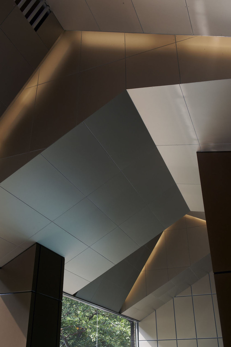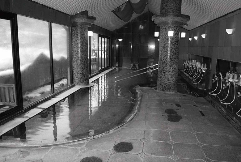 施主は、東日本大震災後にリノベーションを決断して、震災5ヶ月目の8月11日にリニューアルオープン。よもぎ山に面し四季のそれぞれの借景を楽しむことが出来る。よもぎ山といくつかの離れ宿の建物とどのように関係を持たせるかということがひとつの大浴場のテーマとなりました。山の形状および離れ宿の建物の屋根形状は、温泉の水面に映りこみ、それは内壁および天井の形状と重なり合う。内装仕上は、耐季節性の高いアルマイト処理によるブロンズ色アルミニウム・パネル。