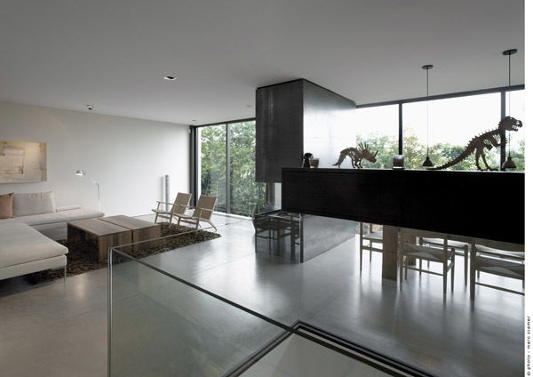 Luminous interior volumes in translucent or opaque white – at times showing traces of underlying wood grain – maintain volumetric clarity. “’Rooms” find themselves somewhere between flowing and compartmentalized, offering the occupants multipurpose or interpretive spaces. The interior and exterior finishes acknowledge the craft of local building trades and complement the precise geometric form with elements of nature and roughness.
