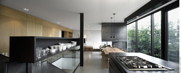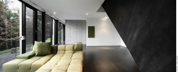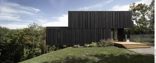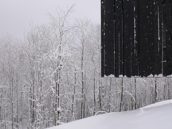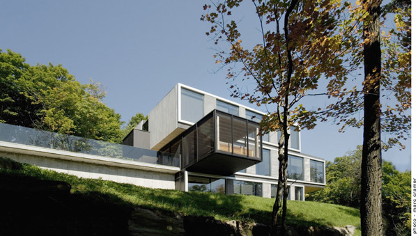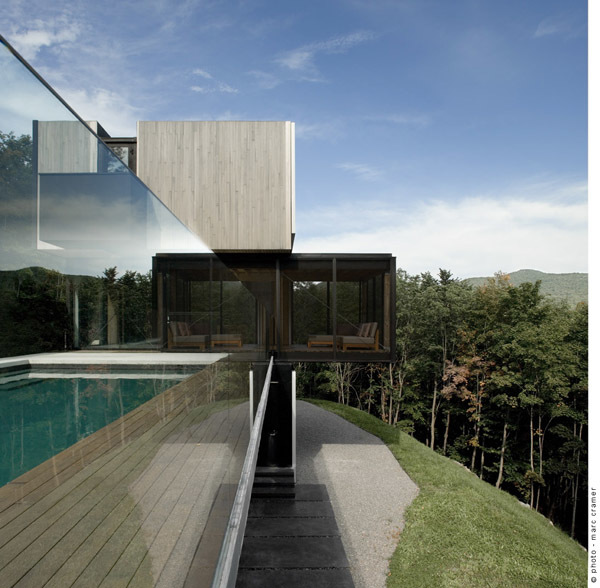 This residence and guest house is located near the ski hills of Mont Tremblant. Pierced in a singular gesture by an oblique interior stair, the main house consists of three bedrooms, living areas, a sauna, a transformable recreation room, and, typical of the region's cottages, a screened outdoor living room. The residence, composed of three superimposed volumes aligned with an entrance-level pool, is placed within a fold in the landscape, creating an intimate exterior space framed by the north façade and a three-meter-high rock outcrop. This location allows for several advantages in terms of exposure to the sun, wind, and the public realm.