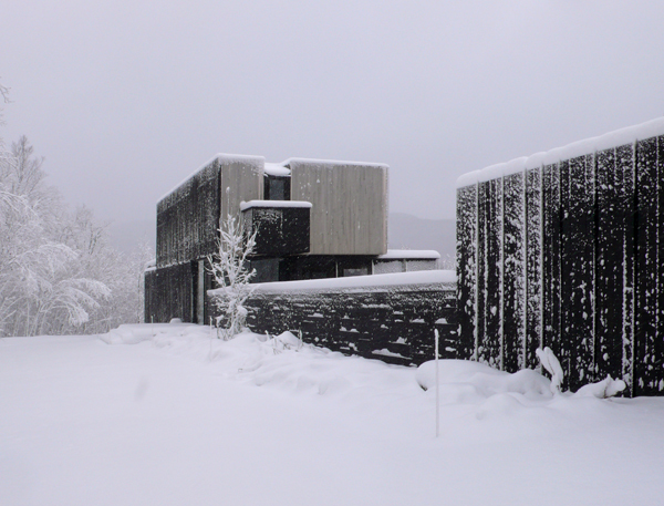 The design draws from the elements belonging to the site: its topography, rock formations, trees, ground cover. Local building traditions (i.e., the log house) are reinterpreted and revealed through chromatic and textural exploration. The house’s surfaces respond to the wooded site, where the verticality of the trees and tones of grey, brown, and green predominate. Echoing the dense context, the north façade is composed of rough-cut wood strips whose irregular spacing permits partially-hidden slit windows. The south façade is open to forest panorama, and the screened porch, seemingly caught between the three overlapping volumes, provides an outdoor living room perched over the wooded landscape.