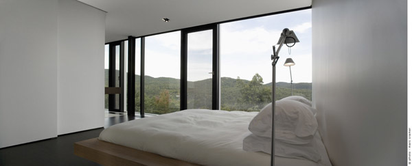 Erosion seems to have caused the blocks to glide laterally, slightly out of synch with each other, yet together forming a harmonious, clear composition. Analogous to the other building blocks, the guest house is envisaged as a fourth prism that has slid westward. The pool deck, between the residence and guest house, affords a sense of enclosure while providing a breathtaking panorama of the rolling mountains. Due to the dramatic slope of the site, two of the volumes of the main house are visible from the entry; the three stacked blocks are only perceived once inside or from the lower portion of the site.