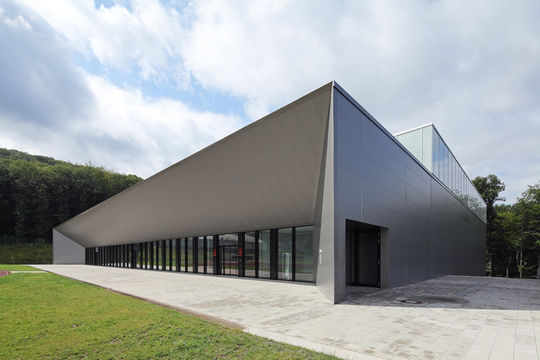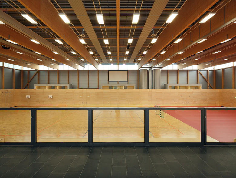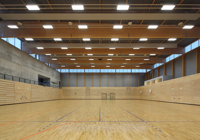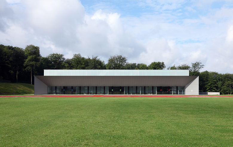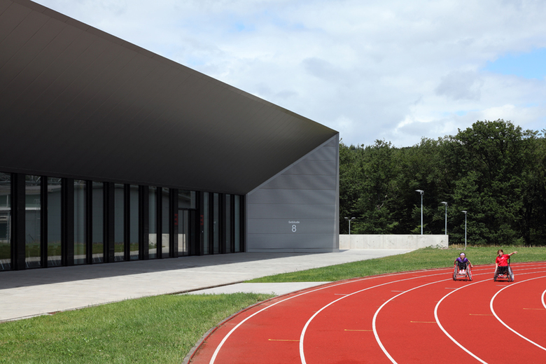 Aus den städtebaulich-topographischen Gegebenheiten, der Optimierung der Trainings- und Wettkampfbedingungen sowie der Erlebbarkeit des Sports durch die Zuschauer entstand ein kompakter Baukörper als Abschluss der Sportanlage. Wesentliche Gestaltungselemente sind die horizontale Schichtung des Gebäudes in einem weitgehend geschlossenen Körper mit einheitlicher Gebäudehülle, der über zwei Geländeniveaus in die Topographie eingebettet ist. Die konkave Gestaltung des Eingangsbereiches führt den Blick des Betrachters zum Wesentlichen des Gebäudes. Ein transluzenter Lichtgaden verleiht dem Gebäude Leichtigkeit und leuchtet den Hallenraum blendfrei aus.