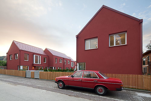 Die beiden Doppelhäuser am dichten und zersplitterten Stadtrand streben nach einer klar erkennbaren Form, ohne den Maßstab zu verlassen. Die Standardfarbe der Dachplatten ist als Hauptfarbe übernommen und steht in Kontrast zu den weißen Kunststofffenstern. Ein pragmatischer Gestaltungsgriff, der den Baukörpern etwas Körperhaftes und doch Künstliches verleiht.